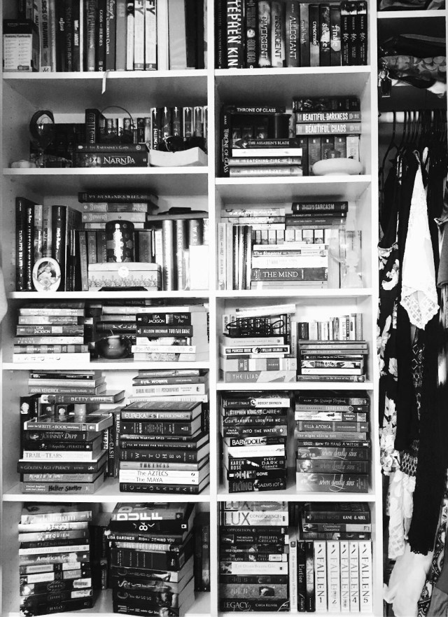 I have been told many times that if one wants to become a writer they need to read every second they can. I began small with just a few shelves and now I have two sides of a closet that look like this.